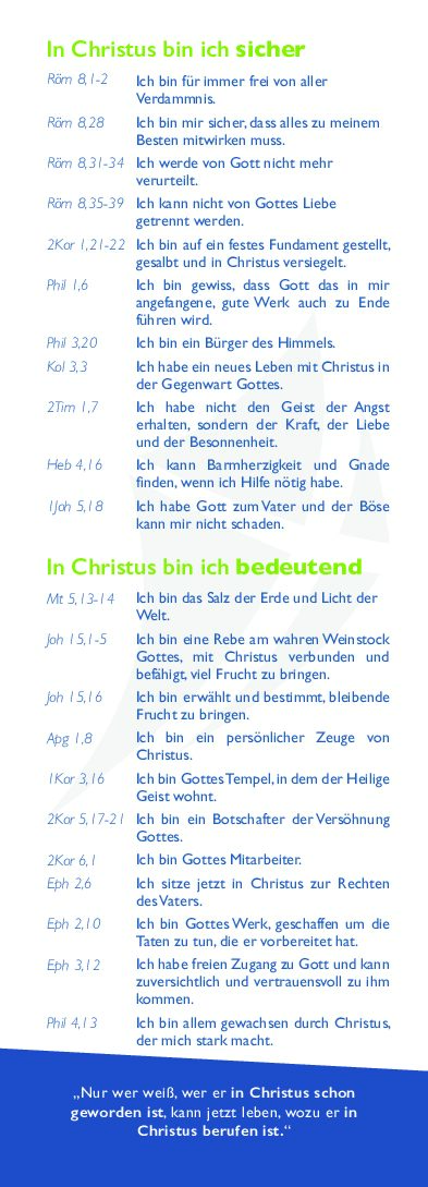 Unsere Annahme, unsere Sicherheit und unser Wert liegen in Christus. 33 Sätze auf der Grundlage der Bibel bestätigen diese Wahrheiten unserer Identität in Christus.